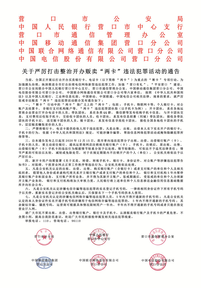 關(guān)于嚴厲打擊整治開辦販賣“兩卡”違法犯罪活動的通告
